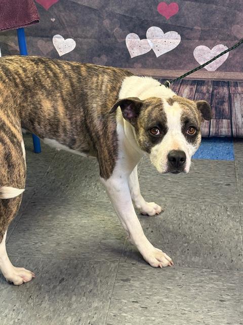 The shelter named me Blossom. I am a 3 year old female brown brindle & white Pit Bull Terrier Mix. I was found not wearing a collar on Aldersgate Ct/ Tuolumne. I have been at the shelter since Wednesday, March 4, 2026. I will be available for adoption on Tuesday, March 10, 2026. Must provide proof of home ownership or landlord approval at the time of adoption.